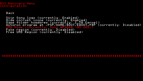 リカバリーモードを起動して、configuration メニューに入ると、UMD Mode に更に項目が加わり、NP9660 -NO UMD- が選択できるようになっています。